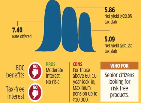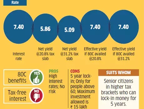 2. Senior Citizen Savings Schemes which offers 7.4% with 80C benefit and lock-in of just 5 years and maximum investment limit of 15 lakhs.