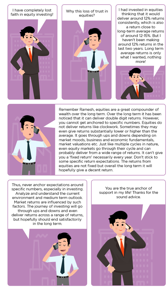 “Anchoring Bias”. Have you heard people saying, “Markets gave 23% this year, I hope I can earn at least 20% in the coming year”. If yes, then this is an example of Anchoring Bias which as the name suggests is about anchoring to values or numbers.