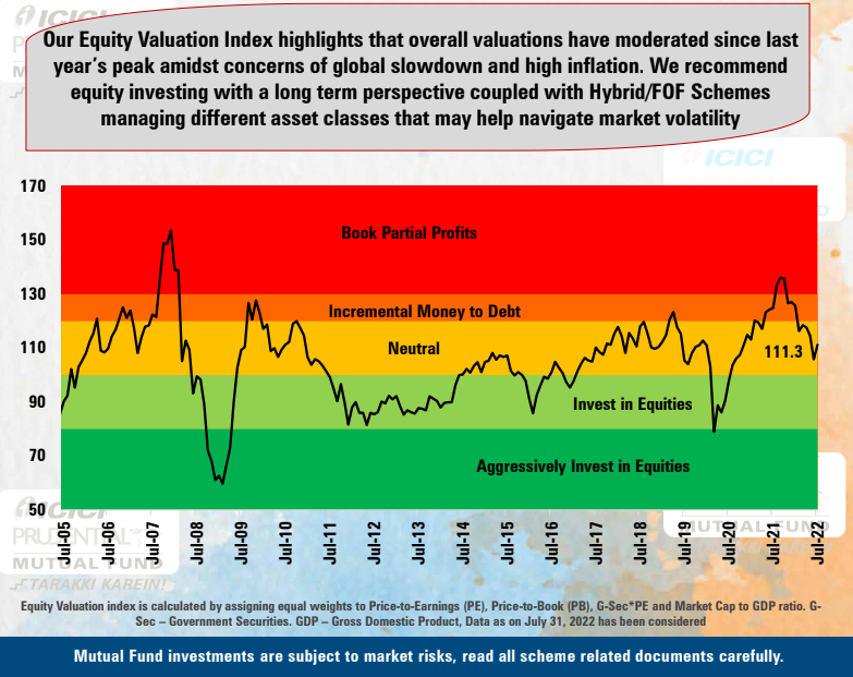 Equity Valuation Index of ICICI Prudential Mutual Fund, this chart gives an idea of where the Market Valuation stands currently and what Investors can infer from the same.