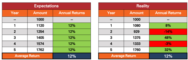When we start investing in Equities or Mutual Funds, we set certain returns target based on the past performance. Though that particular investment will be on track but the path will be very volatile.For example,before investing we might expect our investments to generate 12% annualised returns,but in reality though we might achieve our target returns but it wont be a smooth ride.So if we don’t get the set returns in the initial years we should not exit the plan rather analyse whether we are on the correct investment and stay Invested.