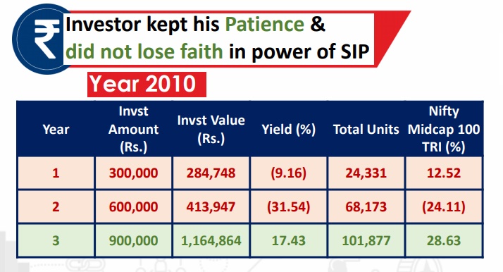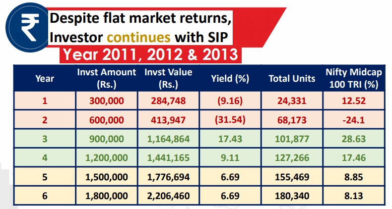 Assume that you start an SIP in a Diversified Midcap Equity fund during the peak of 2008, first two years would have been a washout , but if had continued SIP for one more year, the next year you would have not only recouped the loss of the previous years, but have also made some handsome returns.