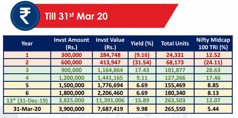 In spite of flat returns for the next two years, you decide to stay invested and accumulate more units, hoping that the history will repeat. But, we are hit by a deadly virus COVID-19 and the whole market collapses and erodes gains made in the last few years.