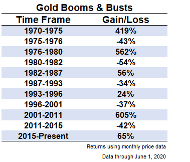 Like every commodity, gold is subject to dramatic boom and bust cycles. But if bought and sold well, people can make money being on the right side of these trends. Put together this look at the boom-bust cycle for the commodity: