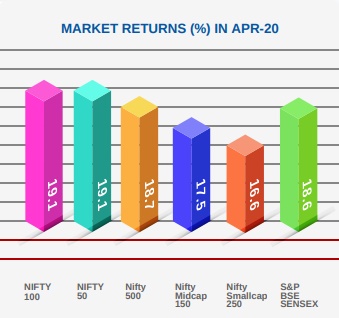 The RBI reduced the reverse repo rate by another 25 bps (after the 90 bps in end March) to 3.75% to further incentivize banks to lend. Nifty 50 and S&P BSE Sensex ended the month of April with 14.7% and 14.4% returns, respectively. Indian domestic market (Sensex) outperformed peer group MSCI Emerging market (9%). BSE Midcap and Small cap indices ended with 13.7% and 15.5% returns, respectively