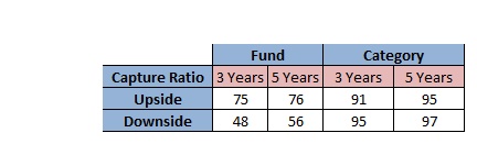 - Minimizes Downside Risk– The fund has been successful at reducing downsides. That is, it has performed better than its benchmark, Nifty 500 TRI in periods when the markets fell. This is possible as the fund takes cash calls when pricey valuations make it difficult to find suitable investment opportunities & the fund manager’s ability to buy stocks at reasonable valuations and is therefore able to limit the downside (from thereon) effectively. This is rightly captured by the Downward Capture Ratio which provides a fund’s ability at containing downsides. A value less than 100% indicates the fund has captured less of the downside in periods when the markets fell. Lower the ratio, the better it is.