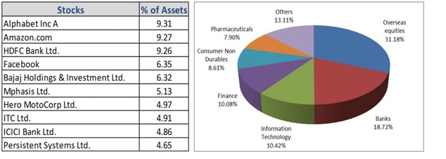 The fund’s exposure to foreign securities helps diversify country-specific risk. It also gives investors the opportunity to invest in companies (such as Facebook, for instance) that may not have Indian counterparts. It can invest up to 35% of its corpus in foreign equity securities.